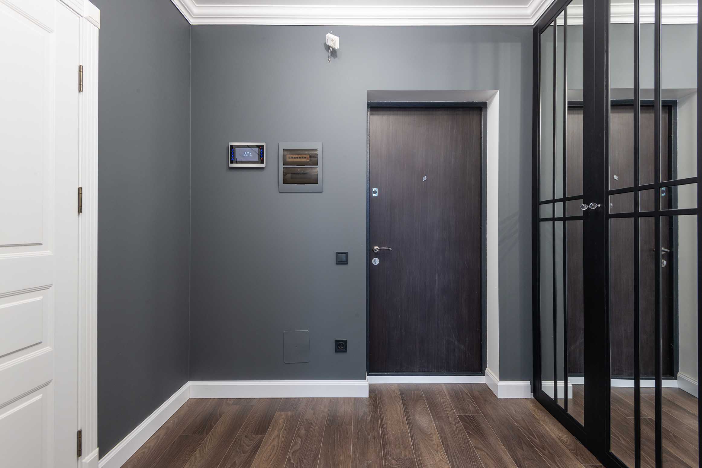 Темное полотно и светлые элементы могут неплохо гармонировать. Но если оттенок двери светлый, а напольное покрытие темное, то для целостности картины, лучше выбрать обрамление в светлых тонах. Темные элементы помогут сделать акцент на контурах проема. Иногда есть смысл подобрать плинтус по цвету мебели.