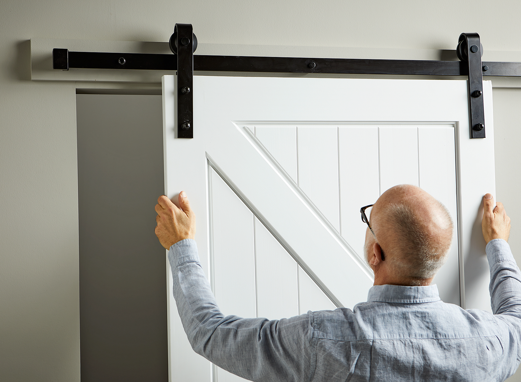 После завершения монтажа направляющих, устанавливаем полотно на рельсы. Для этого необходимо взять двери руками, завести сначала сверху, затем опустить в направляющую снизу, контролируя, чтобы полотно попало роликами в соответствующий паз. Если ролики выпадут и будут препятствовать, можно поправить их рукой.